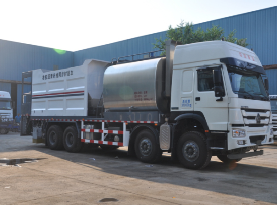 3、該型號(hào)的纖維同步碎石封層車(chē)不需舉升料斗就可實(shí)現(xiàn)石屑撒布施工,方便隧道涵洞施工、橋梁施工、以及彎道施工。